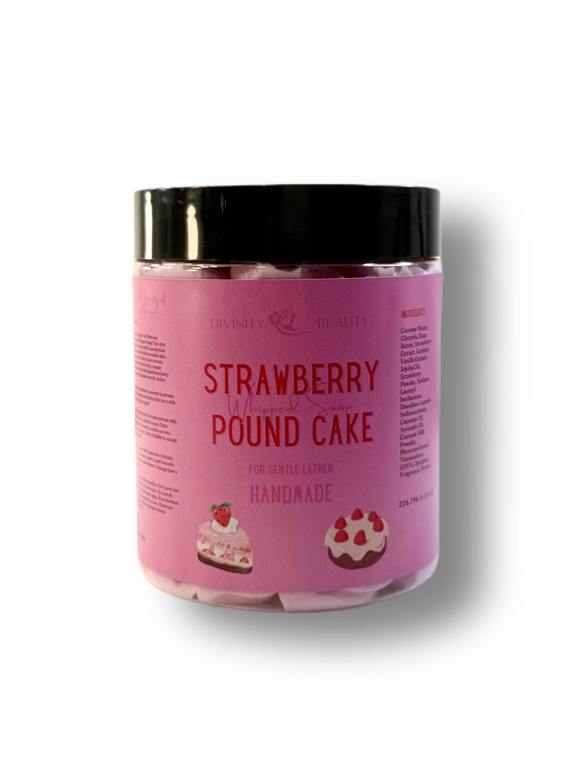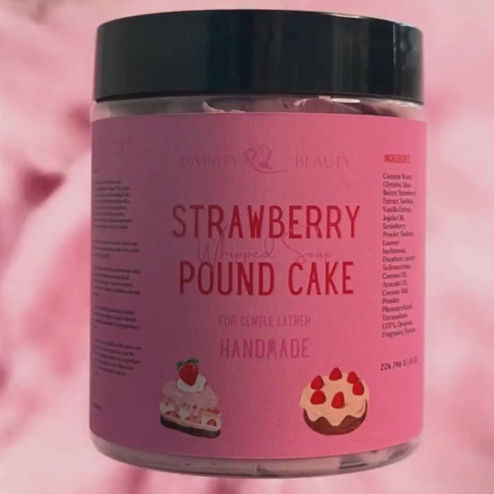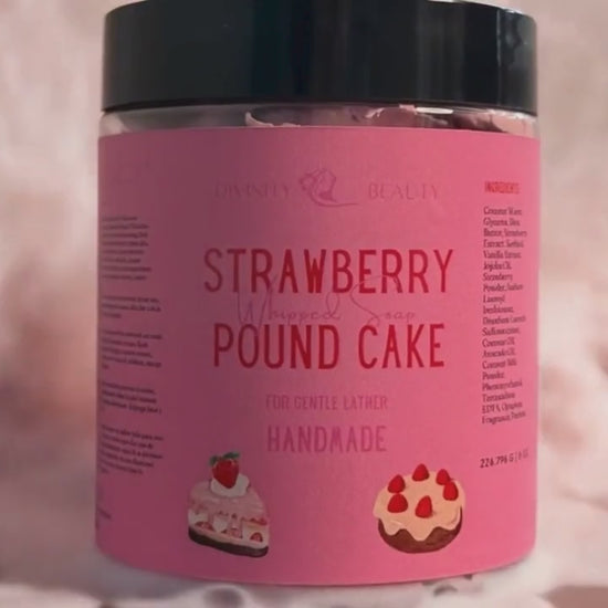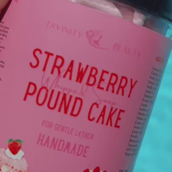 Fluffy, sweet, and totally guilt-free! Meet our Strawberry Pound Cake Whipped Soap! This ultra creamy whipped treat is made with Foaming Bath Butter, Jojoba Oil & Baobab Powder to soften skin, while Cocoa Extract adds a hint of cozy warmth. Lightweight hydration for face & body, creamy foamy lather & smells like freshly baked strawberry cake with vanilla frosting. Pamper sweetly, lather happily!